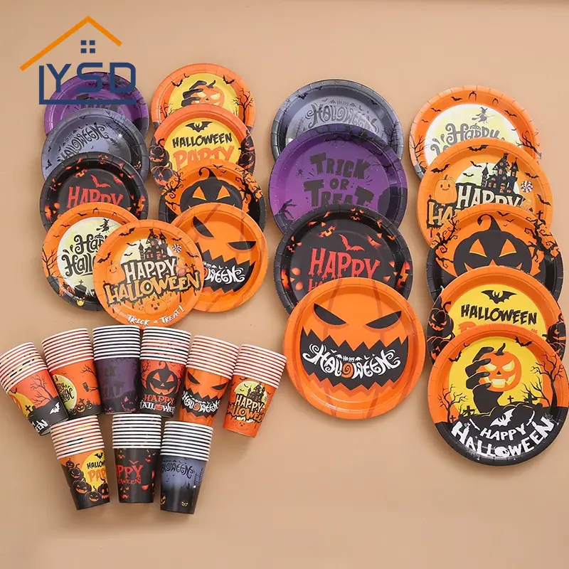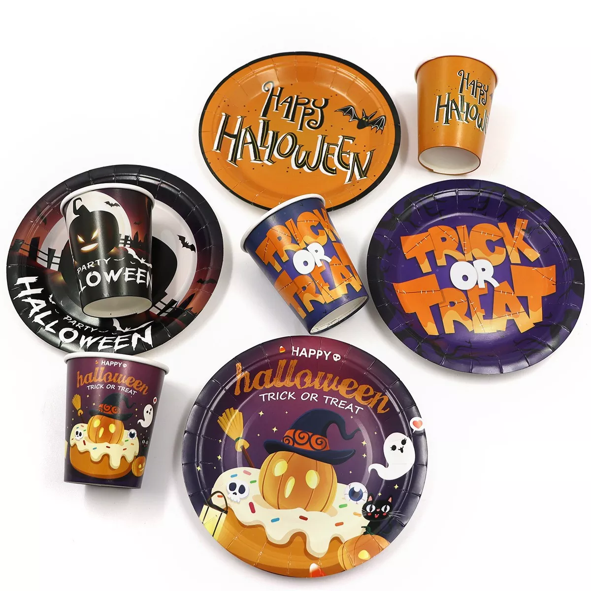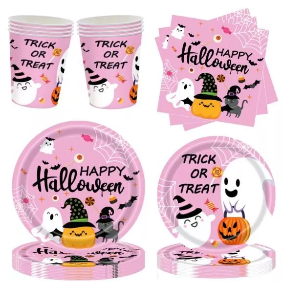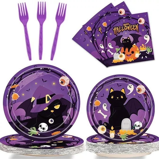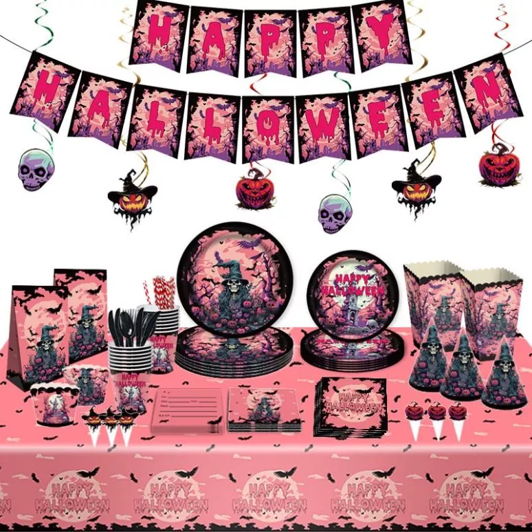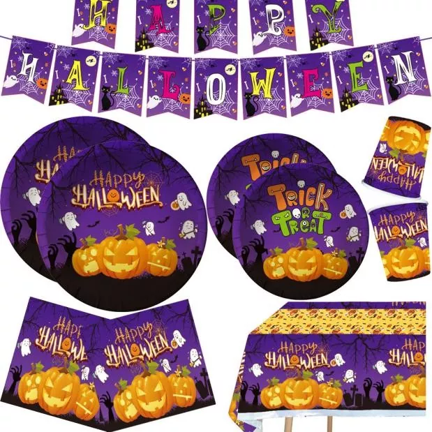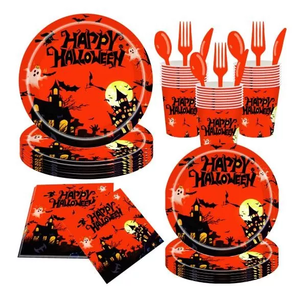 ชุดฮัลโลวีนที่ใช้แล้วทิ้งชุดโต๊ะอาหารมักจะรวมถึงการกำหนดค่าขั้นพื้นฐานเช่นแผ่น, ถ้วย, ผ้าเช็ดปาก, มีด, ส้อมและช้อนและรายการทั้งหมดได้รับการออกแบบด้วยธีมฮัลโลวีนที่โดดเด่น องค์ประกอบรูปแบบทั่วไป ได้แก่ ภาพคลาสสิกเช่นโคมไฟฟักทองตลกแมวดำลึกลับผีลอยน้ำใยแมงมุมและกะโหลกศีรษะ สีส่วนใหญ่ขึ้นอยู่กับสีส้มเทศกาลสีดำสีม่วงและสีเขียวสร้างบรรยากาศฮาโลวีนที่แข็งแกร่งของความลึกลับและความสุข